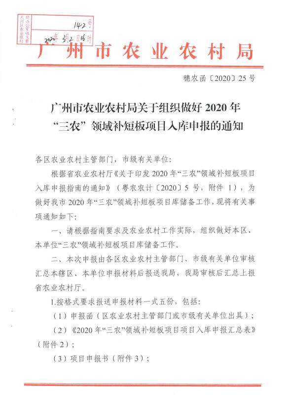 按照《廣州市農(nóng)業(yè)農(nóng)村局關于組織做好2020年“三農(nóng)”領域補短板項目入庫申報的通知》(穗農(nóng)函〔2020〕25號)要求,為做好我區(qū)2020年“三農(nóng)”領域補短板項目庫儲備工作,現(xiàn)將有關事項通知如下: